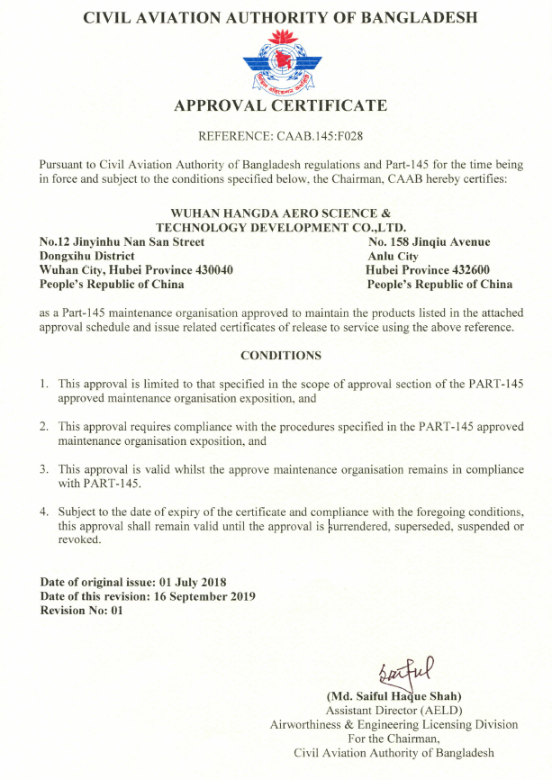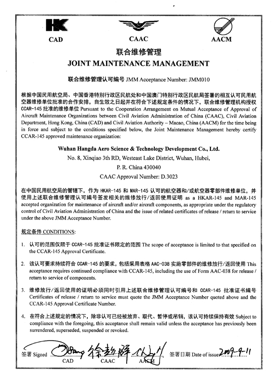 200110月    公司獲中國民航總局授權的民航維修許可證。